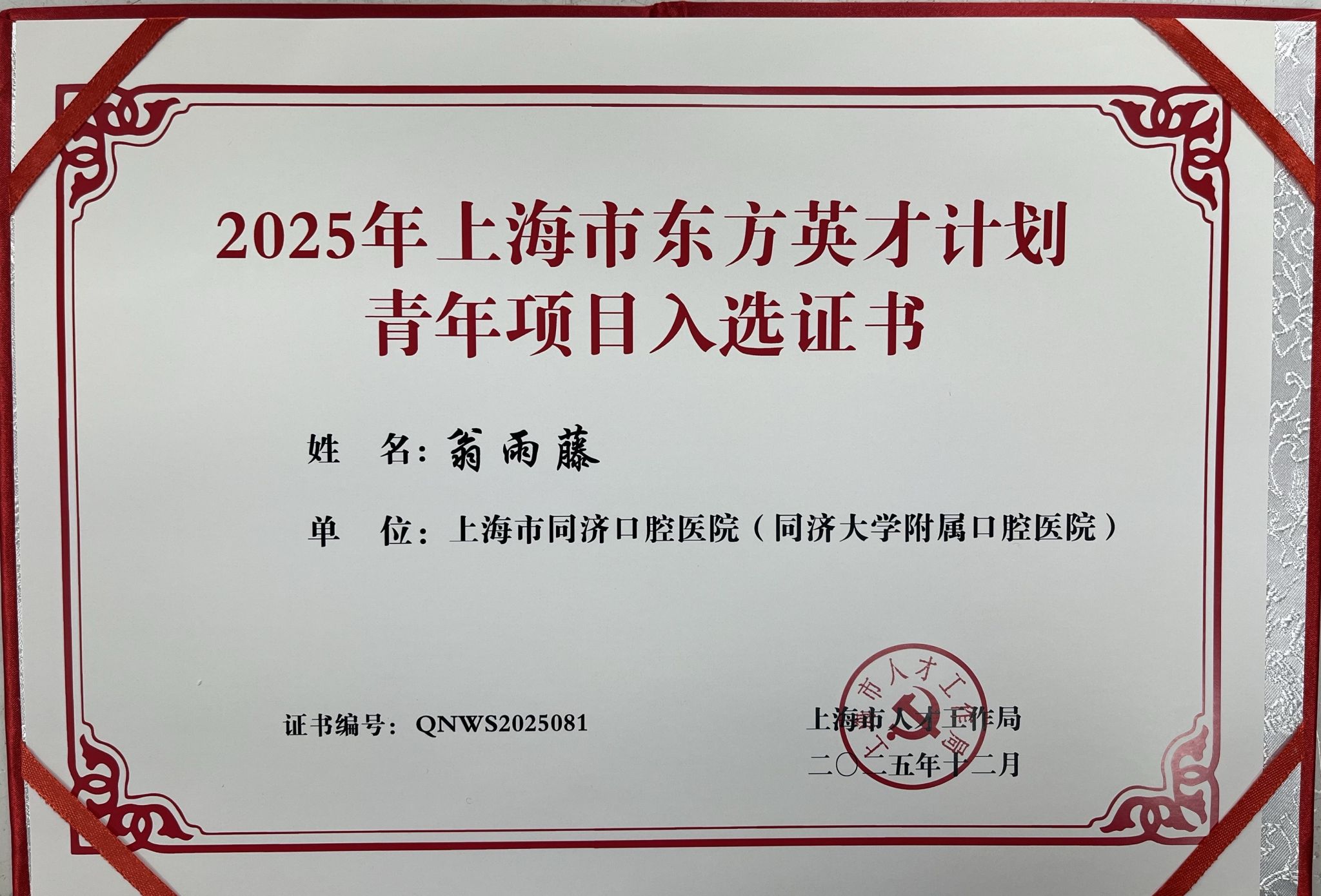 根据《上海市人才计划管理办法》、《关于开展2025年东方英才计划拔尖、青年项目卫生平台申报评审工作的通知》,经个人申报、逐级推荐、专家评审等程序,我院数字化诊疗中心刘伟才主任与口腔种植科翁雨藤医师分别入选2025年上海市东方英才计划拔尖项目与青年项目(卫生平台)。